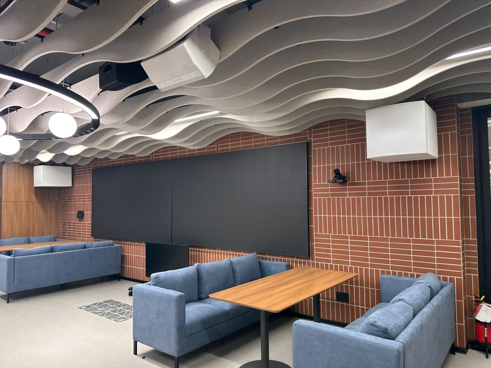 Two 130" Samsung LED walls supported by distributed AV across café, gym, and breakout zones for employee engagement.